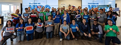 图:2019年,在都柏林的欧洲总部,Workday的员工手持代表他们国籍的旗帜。