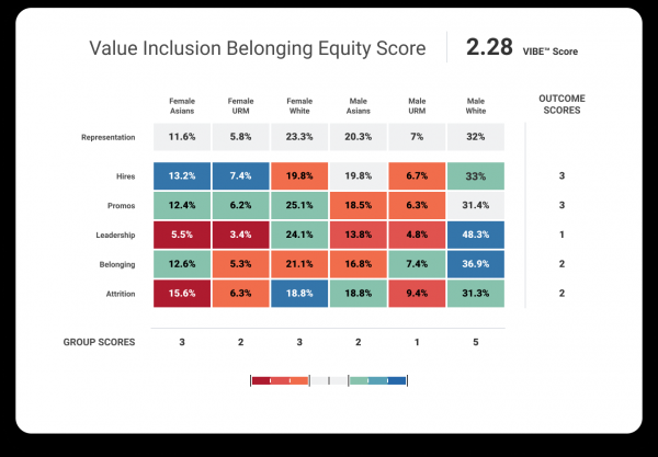 - Parity and Equity Evaluation.The VIBE Index will evaluate where parity is lacking in the workplace and then provide a heat map to identify where there is the greatest opportunity to drive positive change. For example, it could highlight inequities in promotions and leadership opportunities provided to Asian women and Black women in comparison to Asian men and White men in Marketing, with a heat map indicating greater focus is needed in talent development to improve the chances for Asian and Black women to be promoted into leadership roles.
