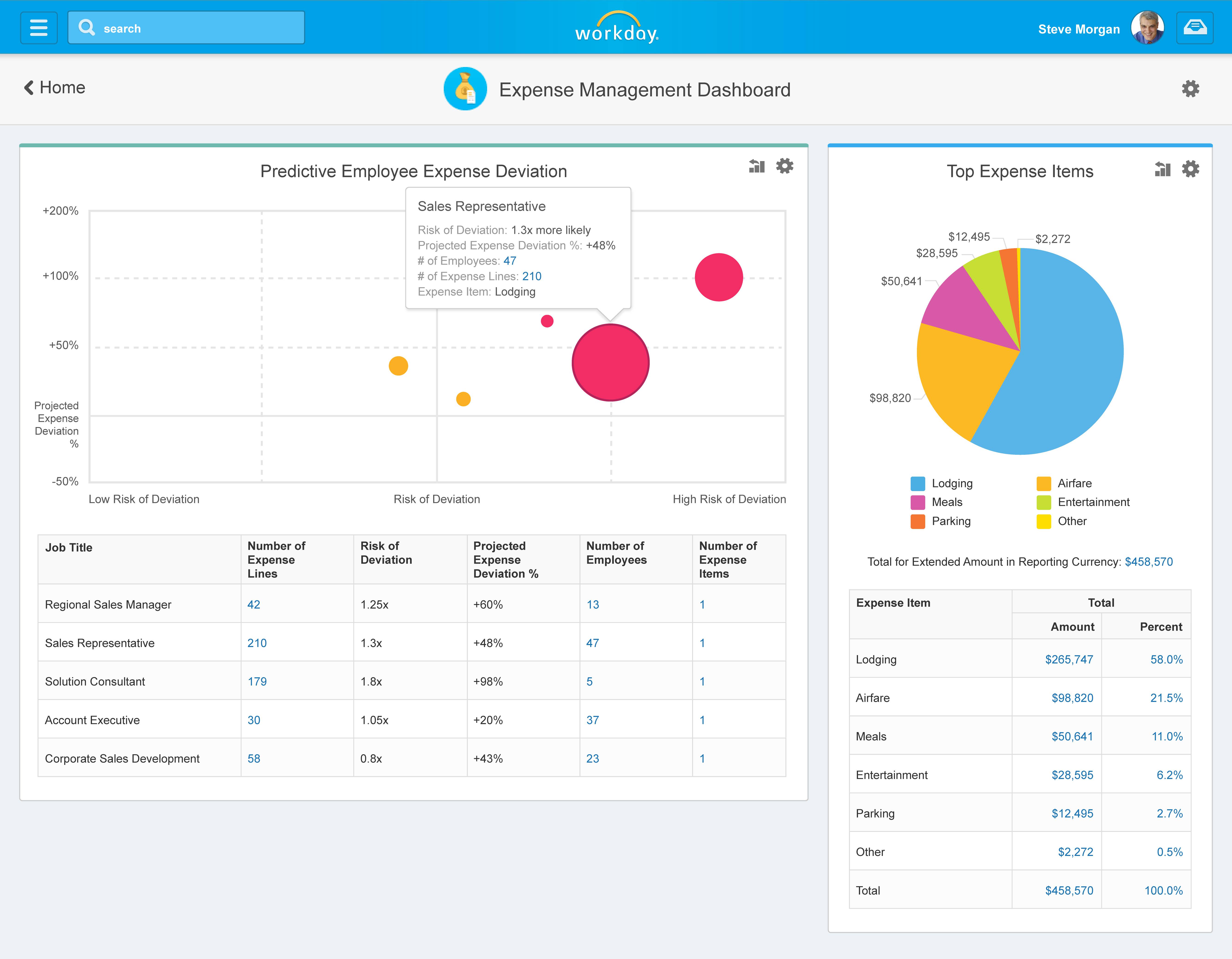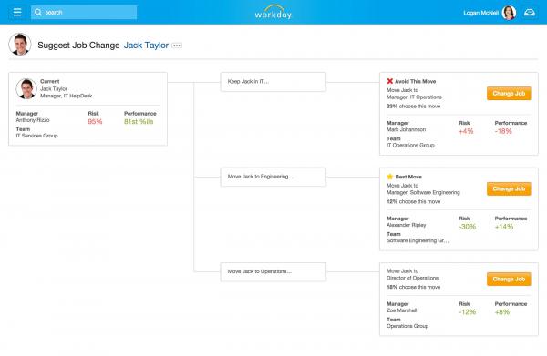 Workday Insight Applications will take the historical data in Workday, combine it with pre-configured sources of non-Workday data, and then will apply data science and machine learning algorithms in order to produce predictive insights and recommendations for specific business scenarios. With these recommendations, customers can expect to more accurately address a range of business questions and challenges such as selecting an internal career path for a top performer at risk of leaving or proactively identifying travel and entertainment expense policy abuse. - One Complete System to Take Action